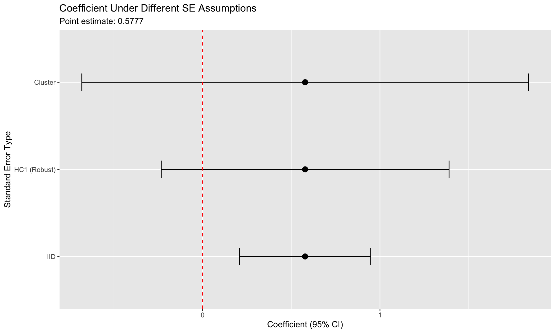 title = "Coefficient Under Different SE Assumptions",