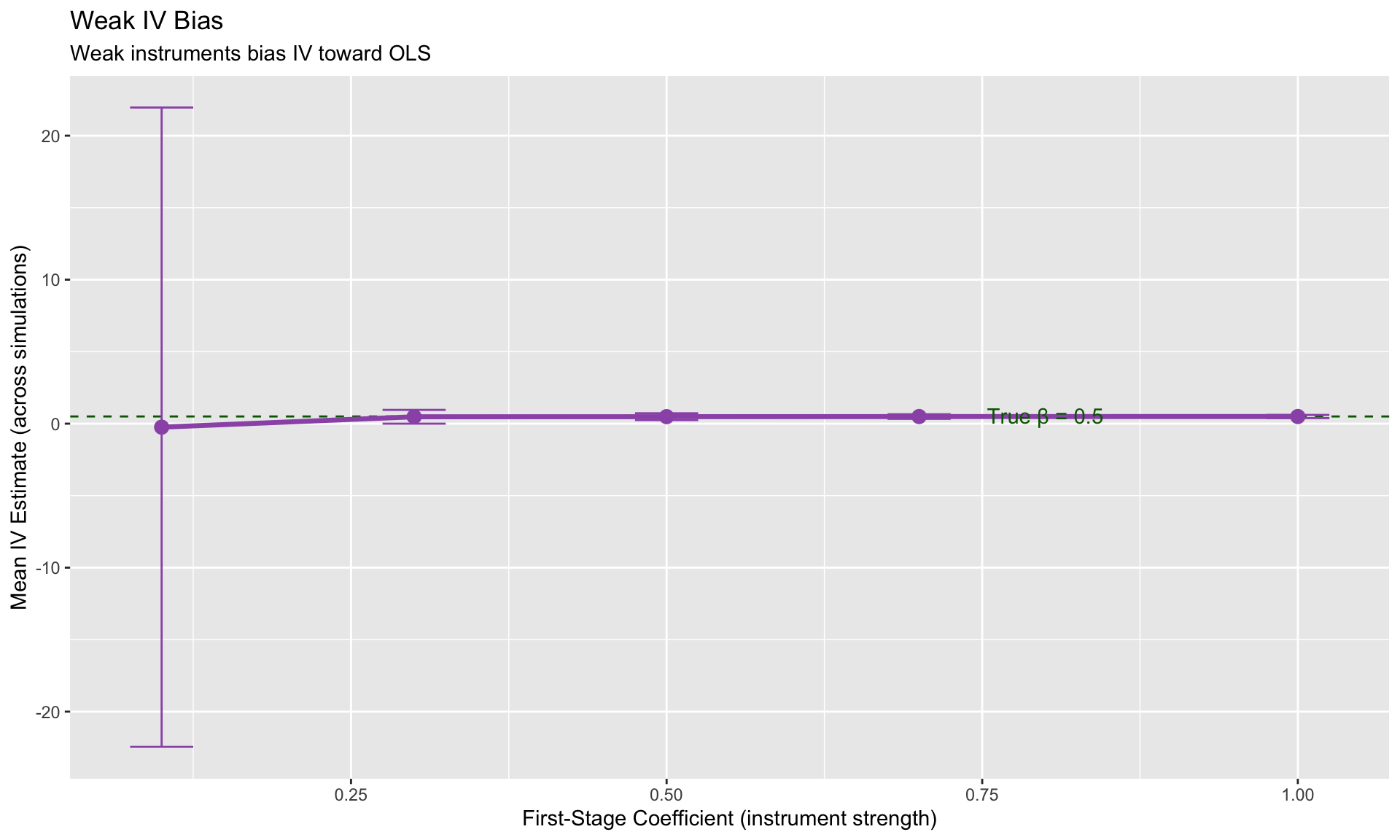 | Weak instruments | Bias toward OLS | Report first-stage F, use robust methods |