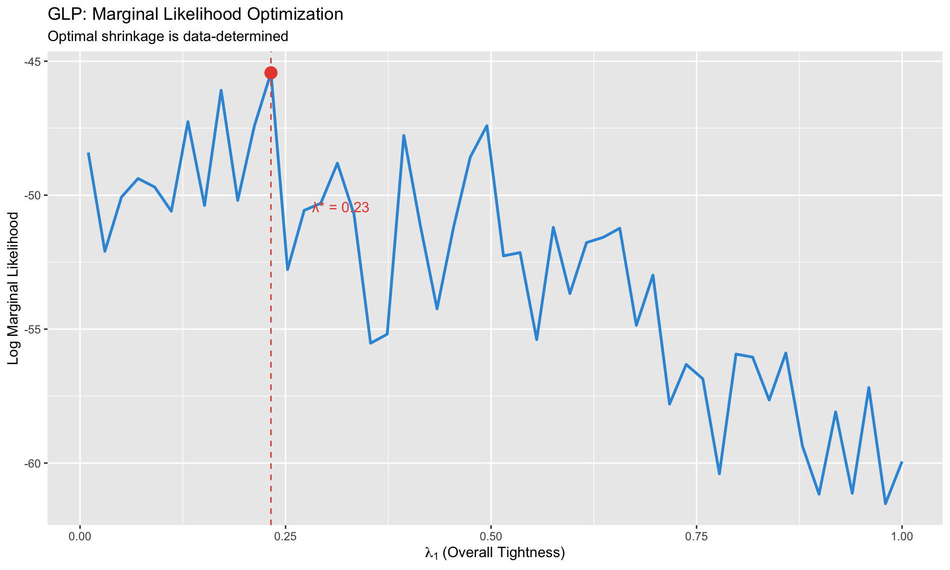 2. **Minnesota Prior**: Encodes beliefs that macro variables are persistent, own lags dominate, recent lags matter more