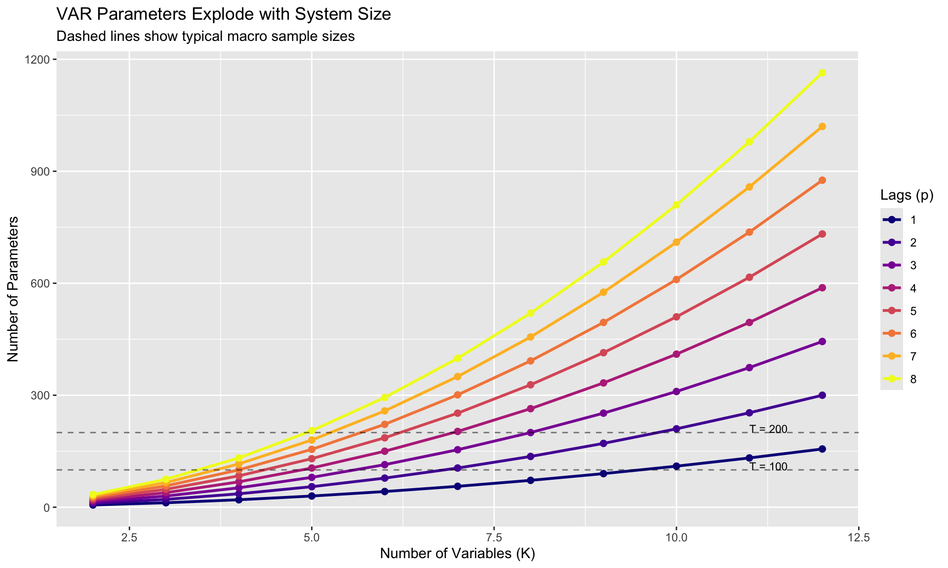 | Variables (K) | Lags (p) | Parameters | Typical Macro Sample (T=200) |