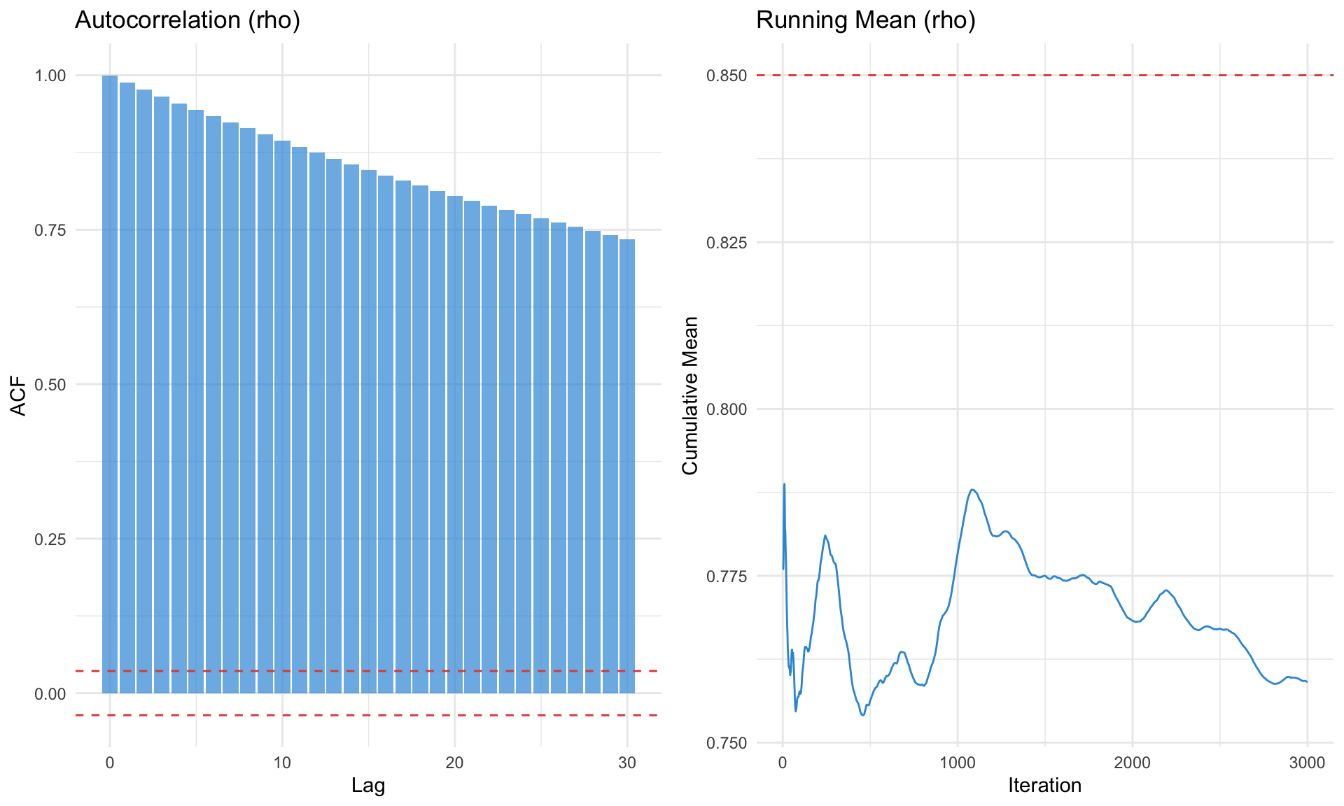 labs(title = "Running Mean (rho)", x = "Iteration", y = "Cumulative Mean") +