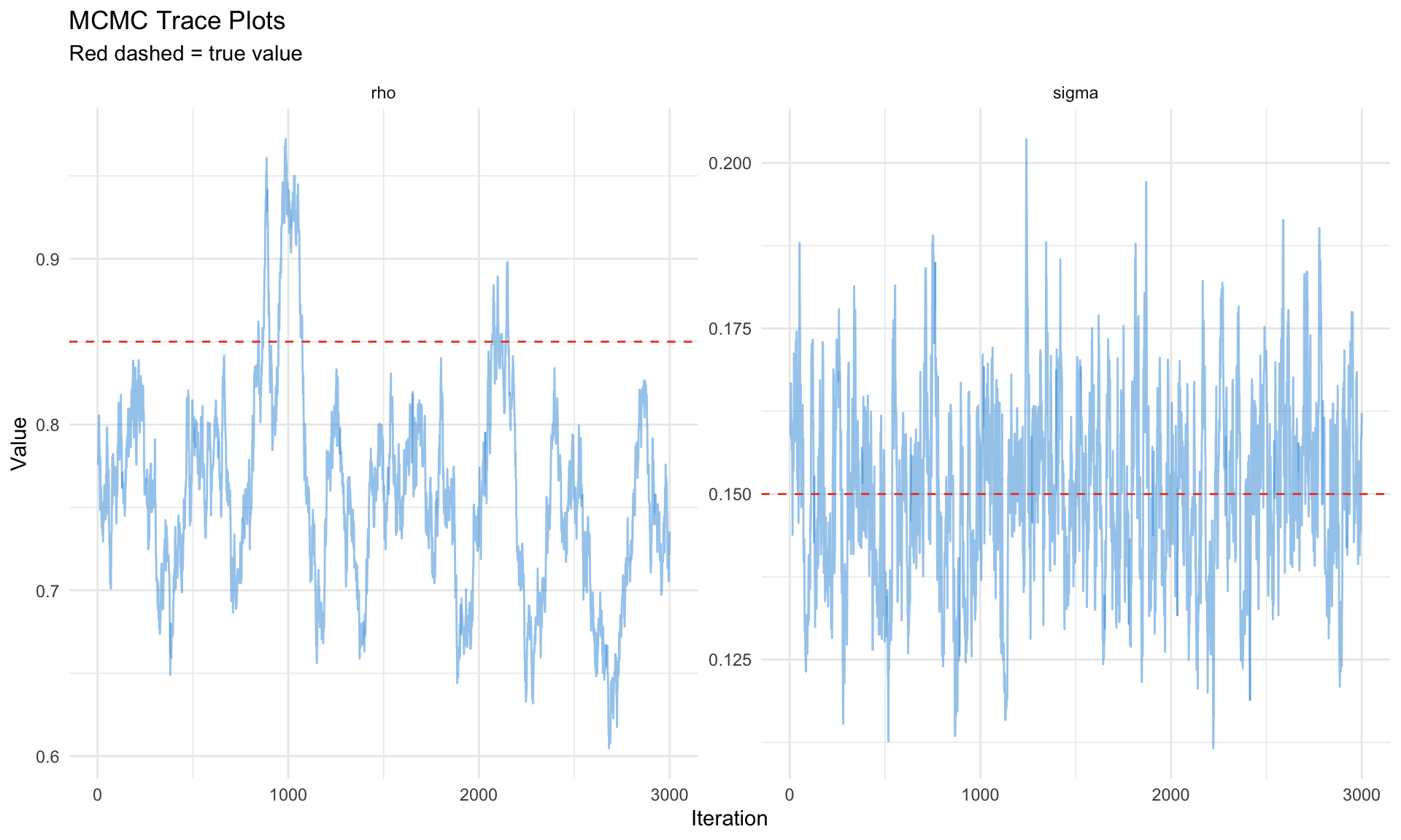 geom_hline(yintercept = rho_true, linetype = "dashed", color = "#e74c3c") +