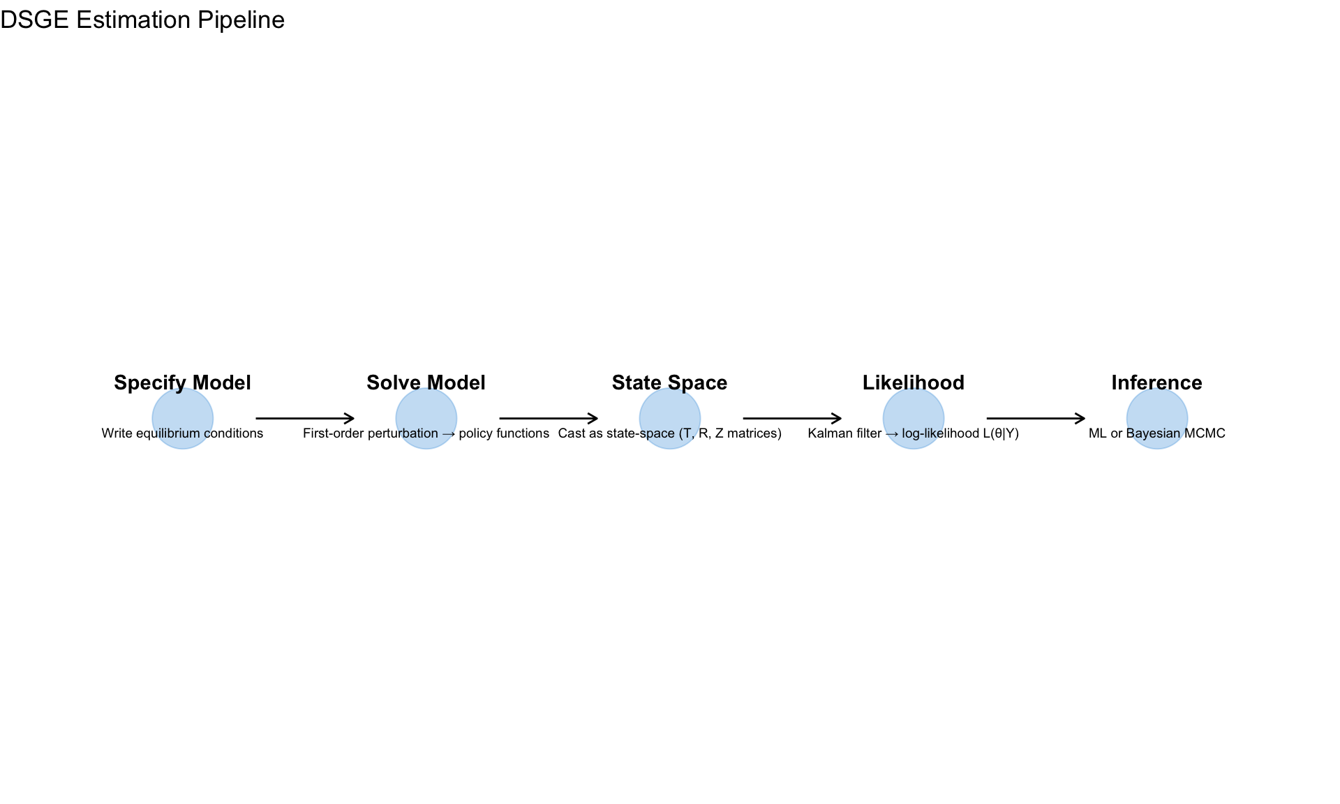 | State space | DSGE solution → transition + observation equations |