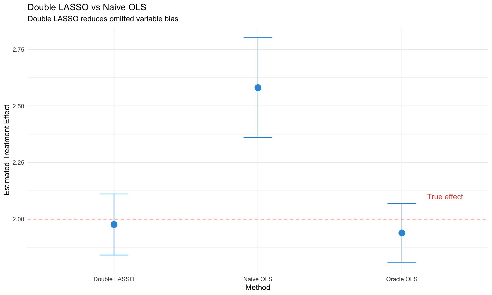 - **Causal inference**: Double LASSO for high-dimensional controls