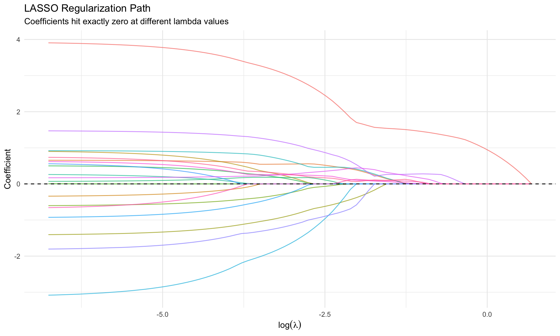 | **Shrinks to exactly zero** | Automatic variable selection |