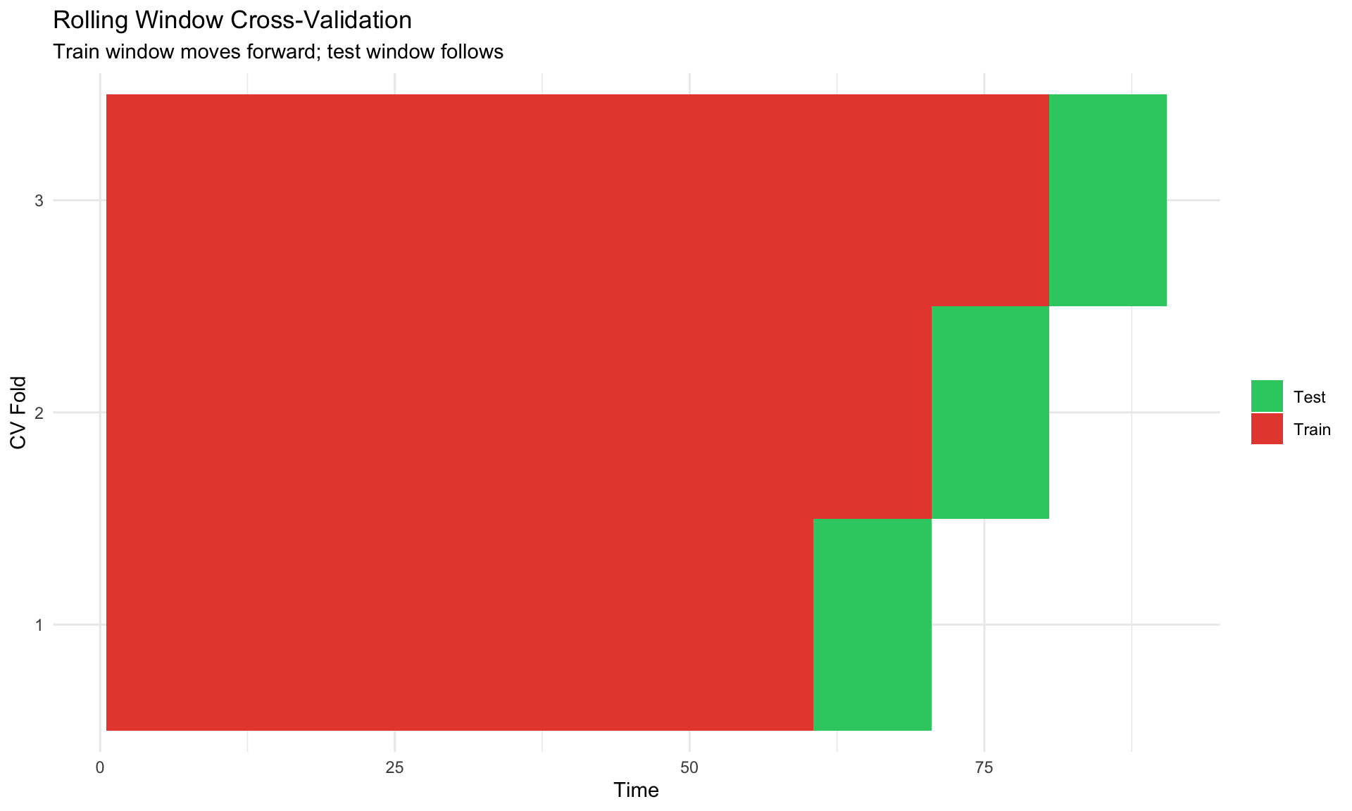 1. **Rolling window CV**: Train on $t=1,\ldots,s$, test on $s+1,\ldots,s+h$